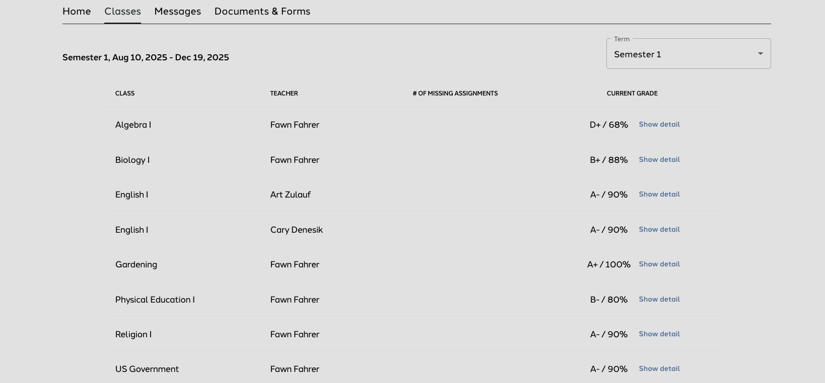 Parents can view the Class Name, the Teacher's name, any missing assignments for the student, as well as the class grade percentage. They can also select Show Detail to see the breakdown of the class categories.