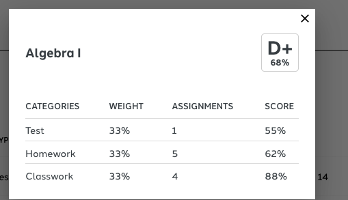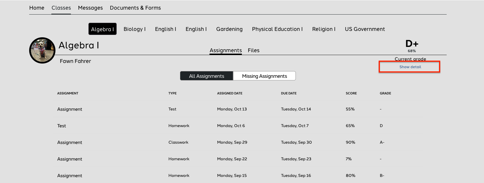 In this view of Classes the parents can see the class, the assignments, missing assignments, the grades on the assignments and select Show Detail to see the breakdown of class categories.