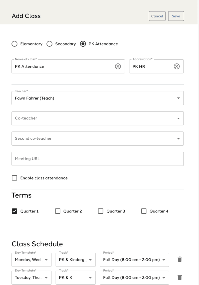 PK Attendance Class Setup