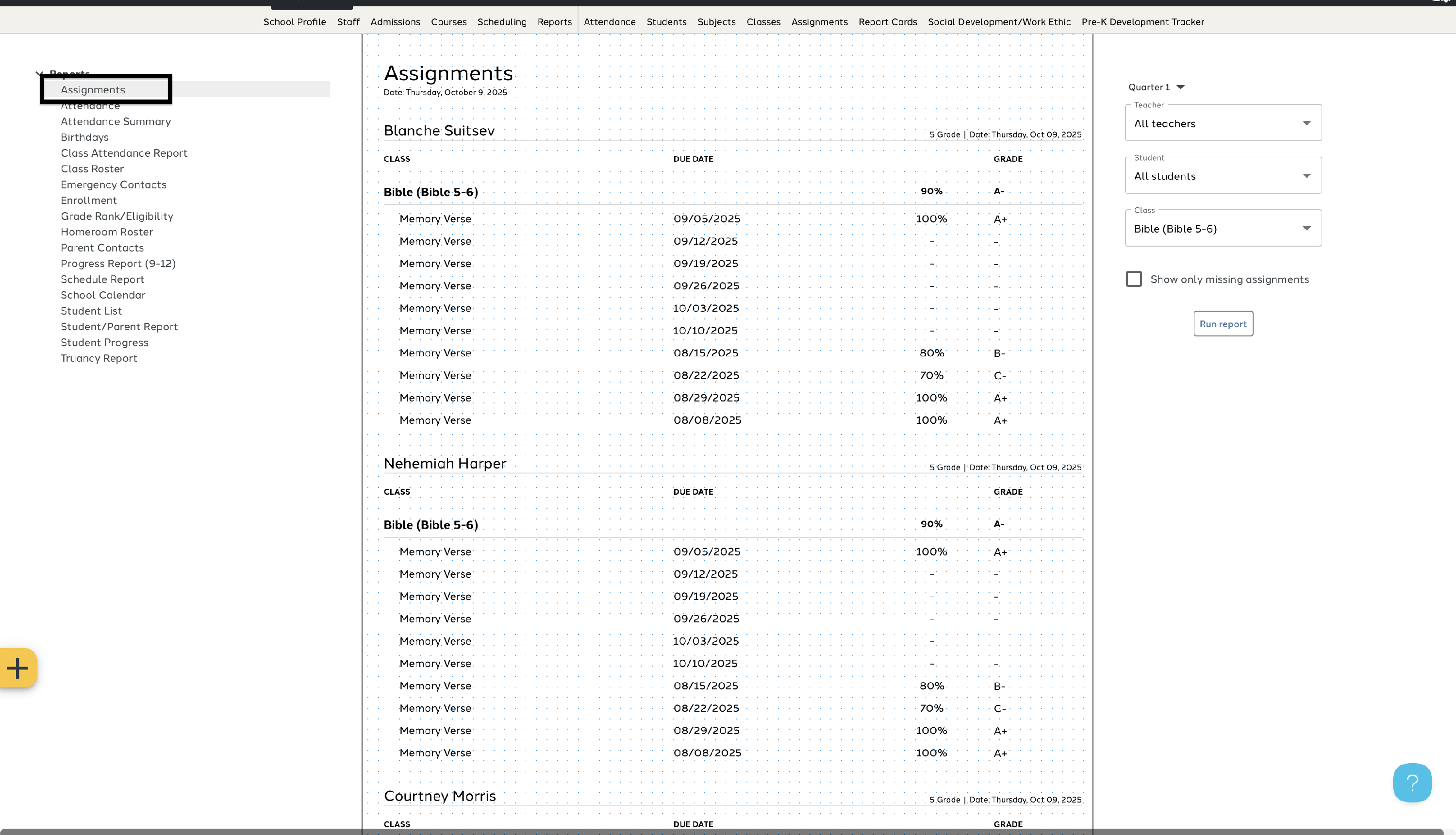 Schools possess the ability to generate an Assignment Report. The Assignment Report can encompass All Assignments, including Missing Assignments, or solely Missing Assignments.