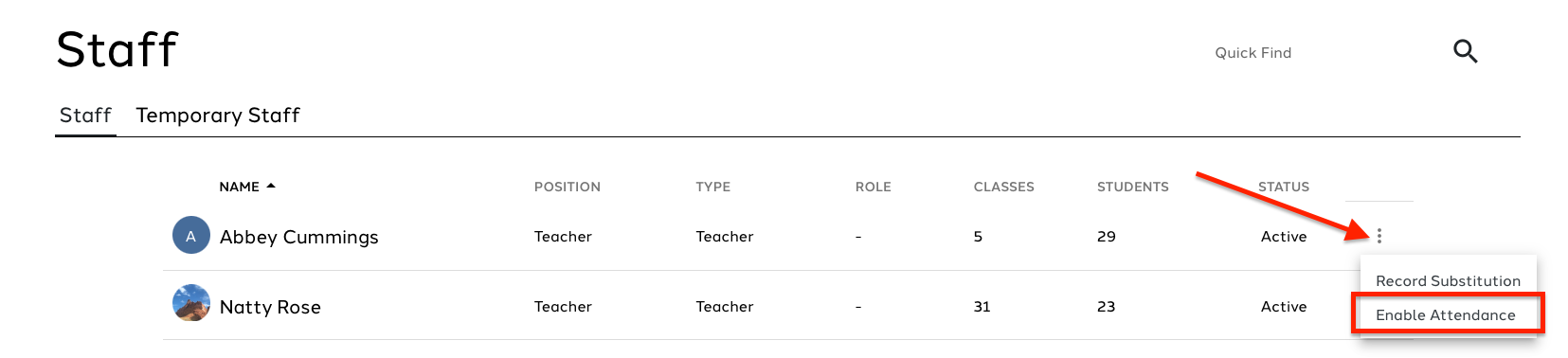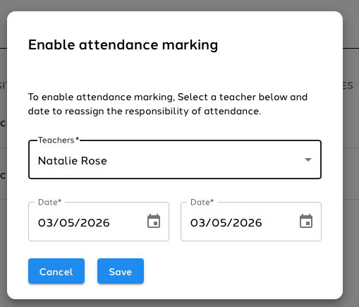 Example: Abbey Cummings is homeroom teacher who is out for the day and Natalie Rose needs to take attendance for Abbey for the day. I would select the menu to the left of Abbey to open the Enable Attendance module. I would then assign Natalie as the teacher and choose the dates Natalie should be able to take attendance for Abbey and save.
