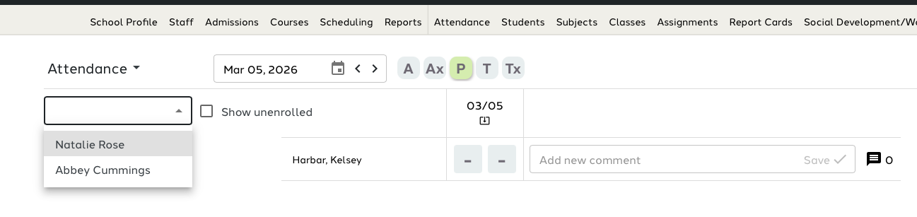 Once this is done Natalie would navigate to Attendance and see a dropdown where she can choose Abbey to access the attendance for the class.