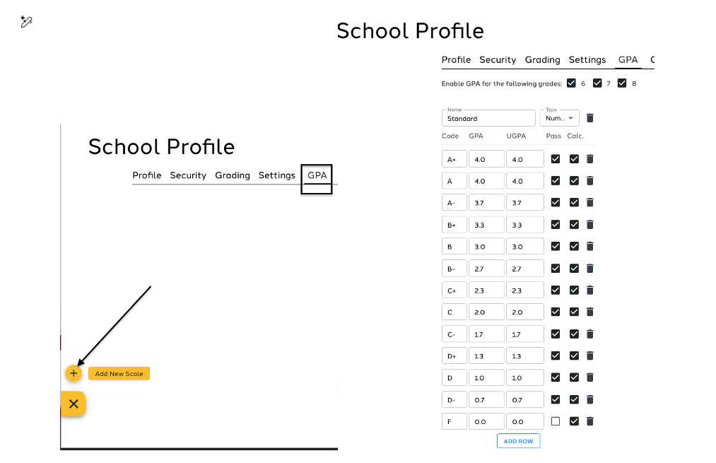 Schools will need to incorporate GPA into their system. When navigating to the School Profile section and selecting GPA, utilize the yellow plus sign to "Add New Scale." The next step involves naming the GPA scale (Standard, High School, AP, etc.) and selecting the Type (Letter or Number). It is recommended that the school opts for the Number type. Use Add Row to add rows to the GPA scale. When done use the Save button.