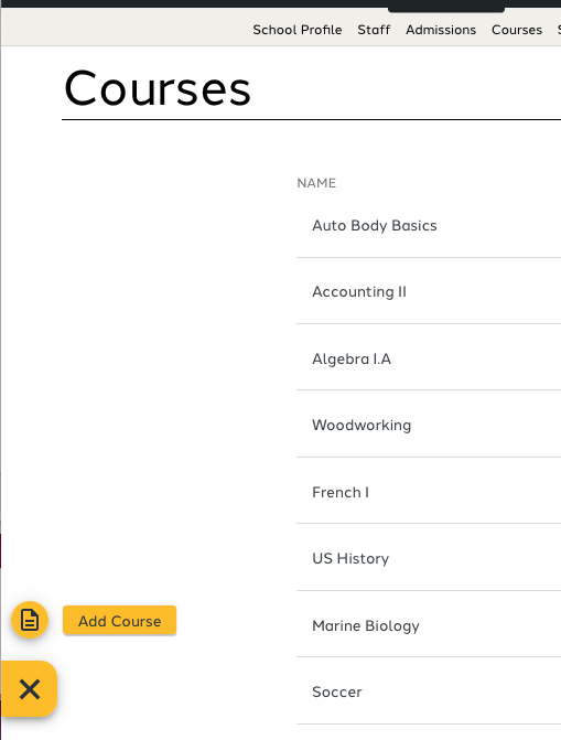 Courses can be added in the Courses tab by clicking on the yellow "+" button labeled "Add Course".