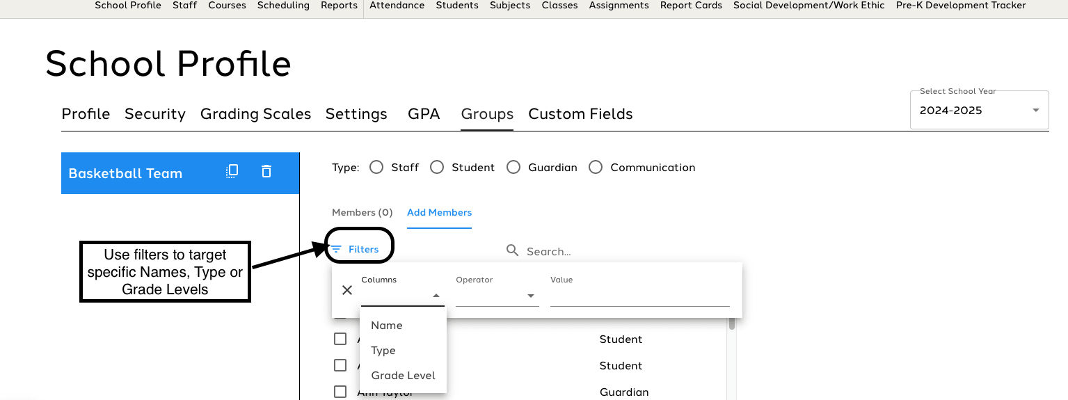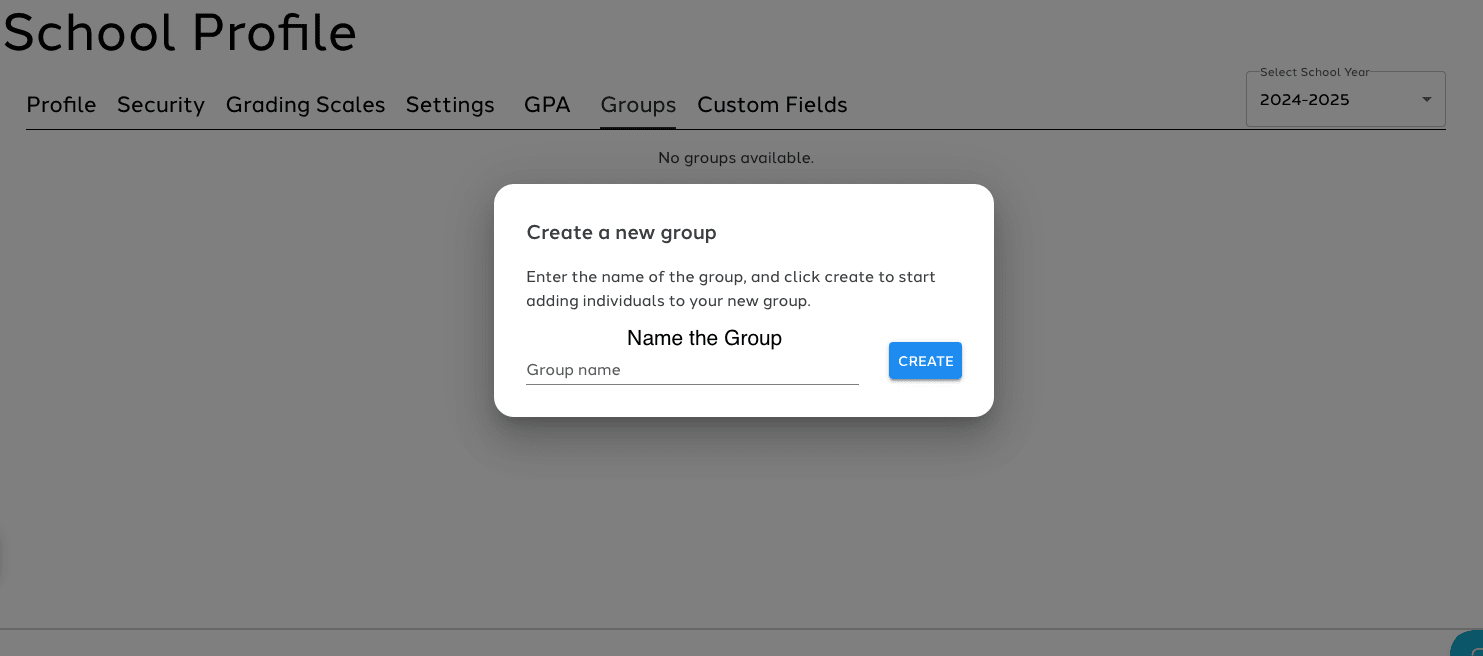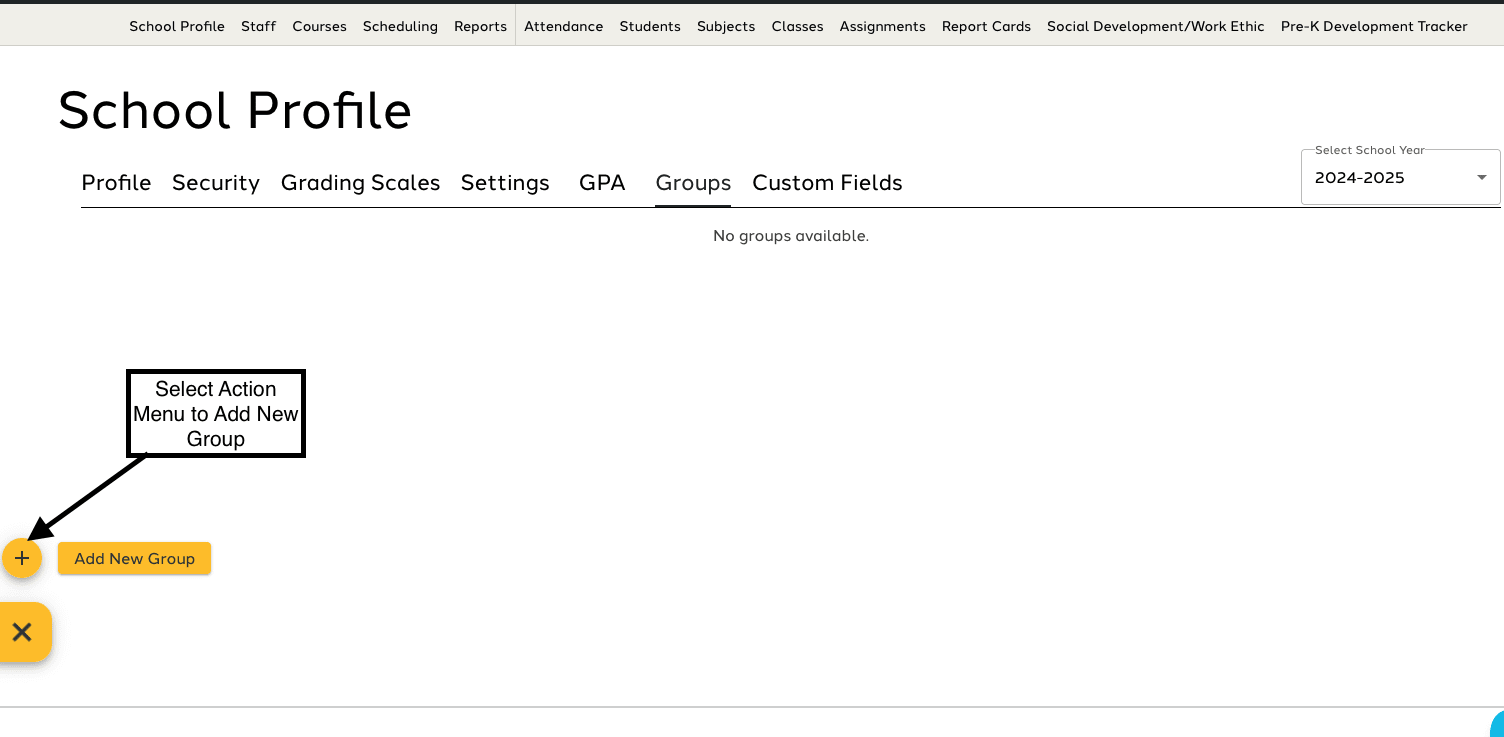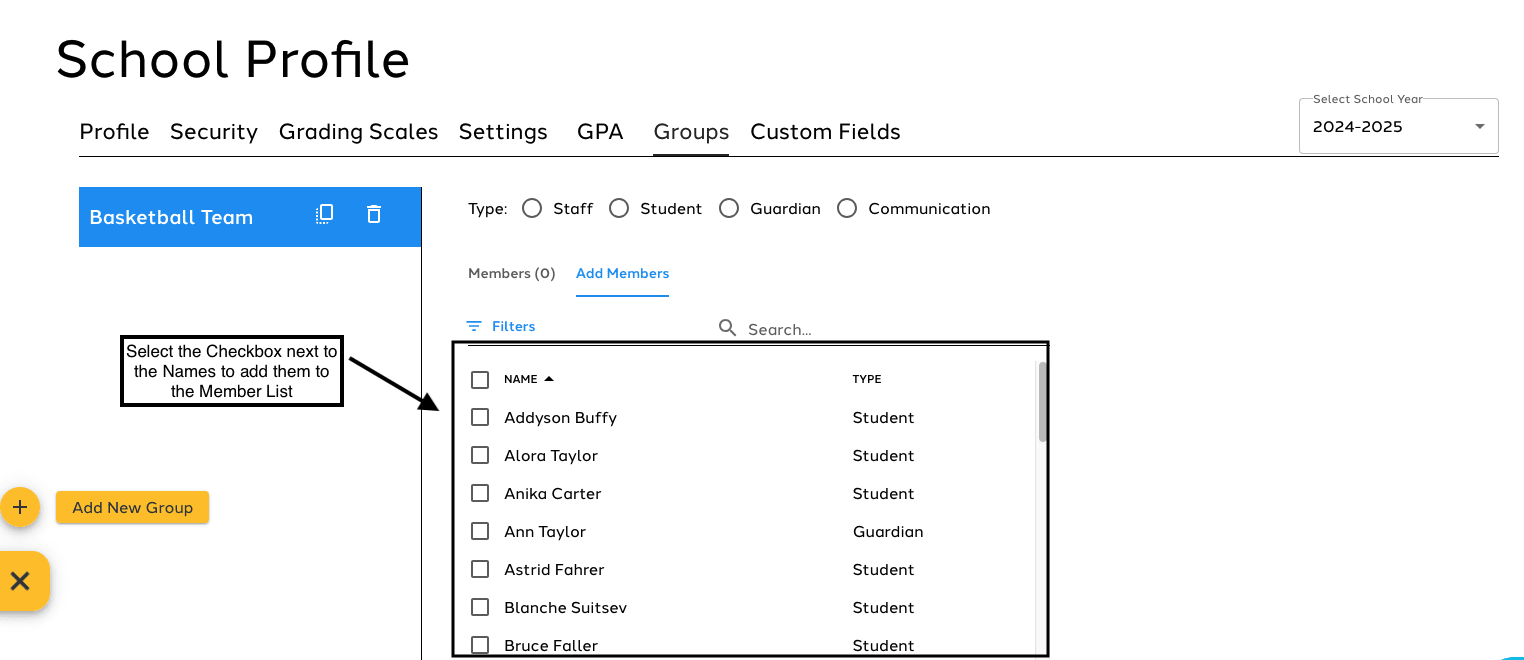 Schools have the ability to create custom groups that are accessible in the messaging area. Users should go to the School Profile and then choose Groups in the School Profile Menu. A new group can be created by using the action menu on the left to “Add New Group.” The group should be given a name. Once the group is created, users can select the Students, Staff, and Guardians who should belong to the group. Users can use the filters to target specific Names, Type, or Grade Level.