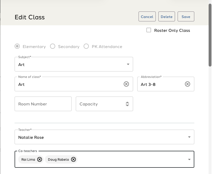 Co-Teachers can be added in the Add Class or Edit Class. The add class or edit class can be found in Scheduling (Admin View) or Class List (teacher view).