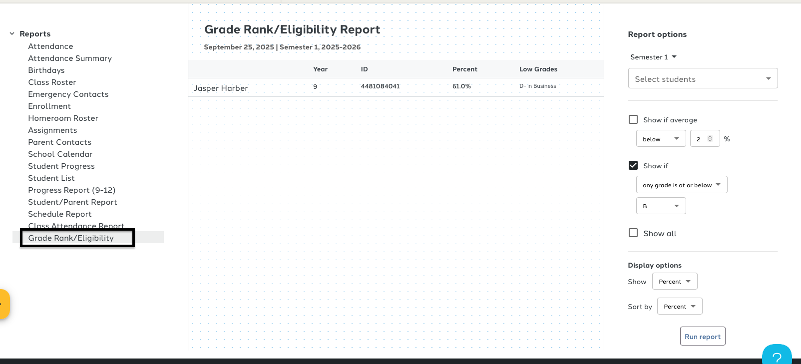 - Navigate to Reports & Grade Rank/Eligibilty Report