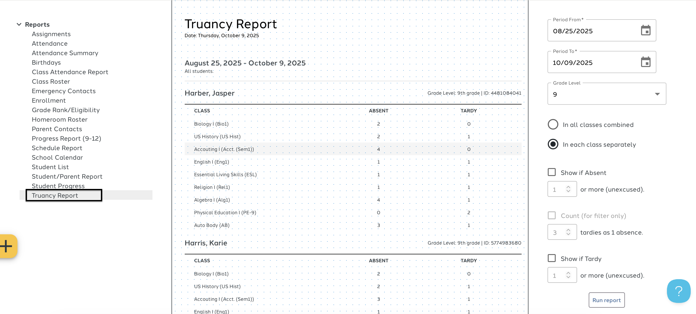 The Truancy Report pertain to classes with Class Attendnce only. This report comprises the student's name, grade ID number, and the total of absent(unexcused) and tardy (unexcused) depending on the filters.