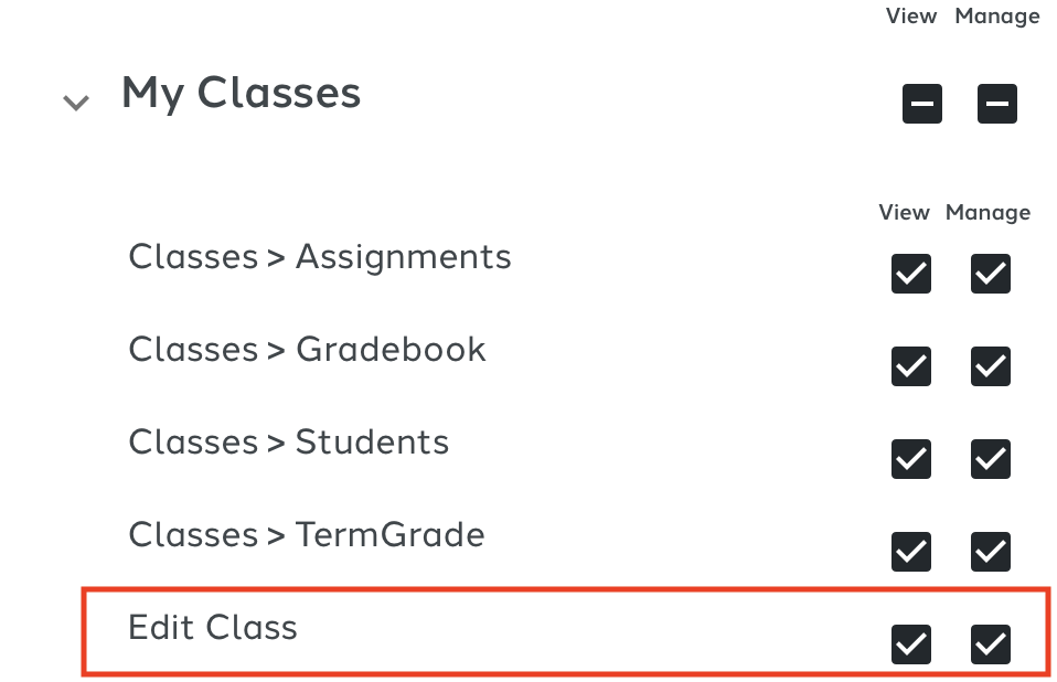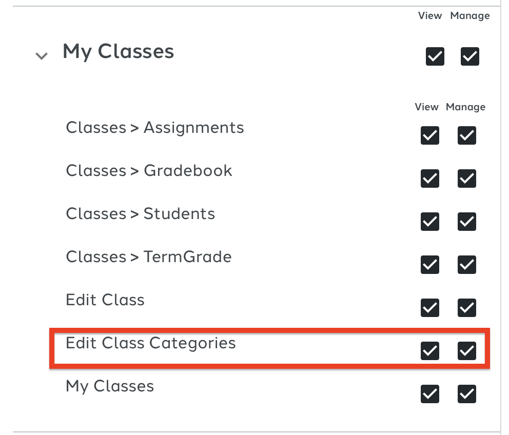 - My Classes > Edit Class Categories: This allows the users to ONLY edit the Class Categories and the Gradebook section of the classes they have access too.