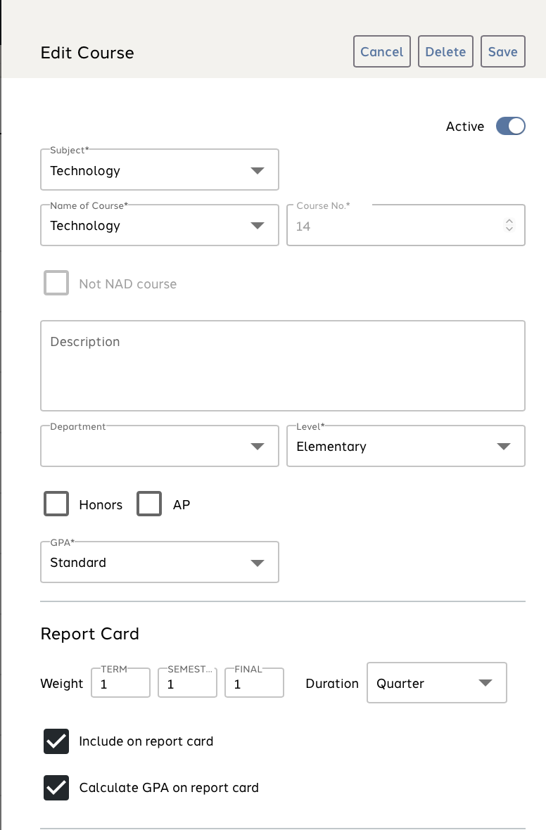 The name of the course MUST match the name of the subject for Elementary. You may noticed other courses when adding course to your elementary but those are ONLY for secondary.