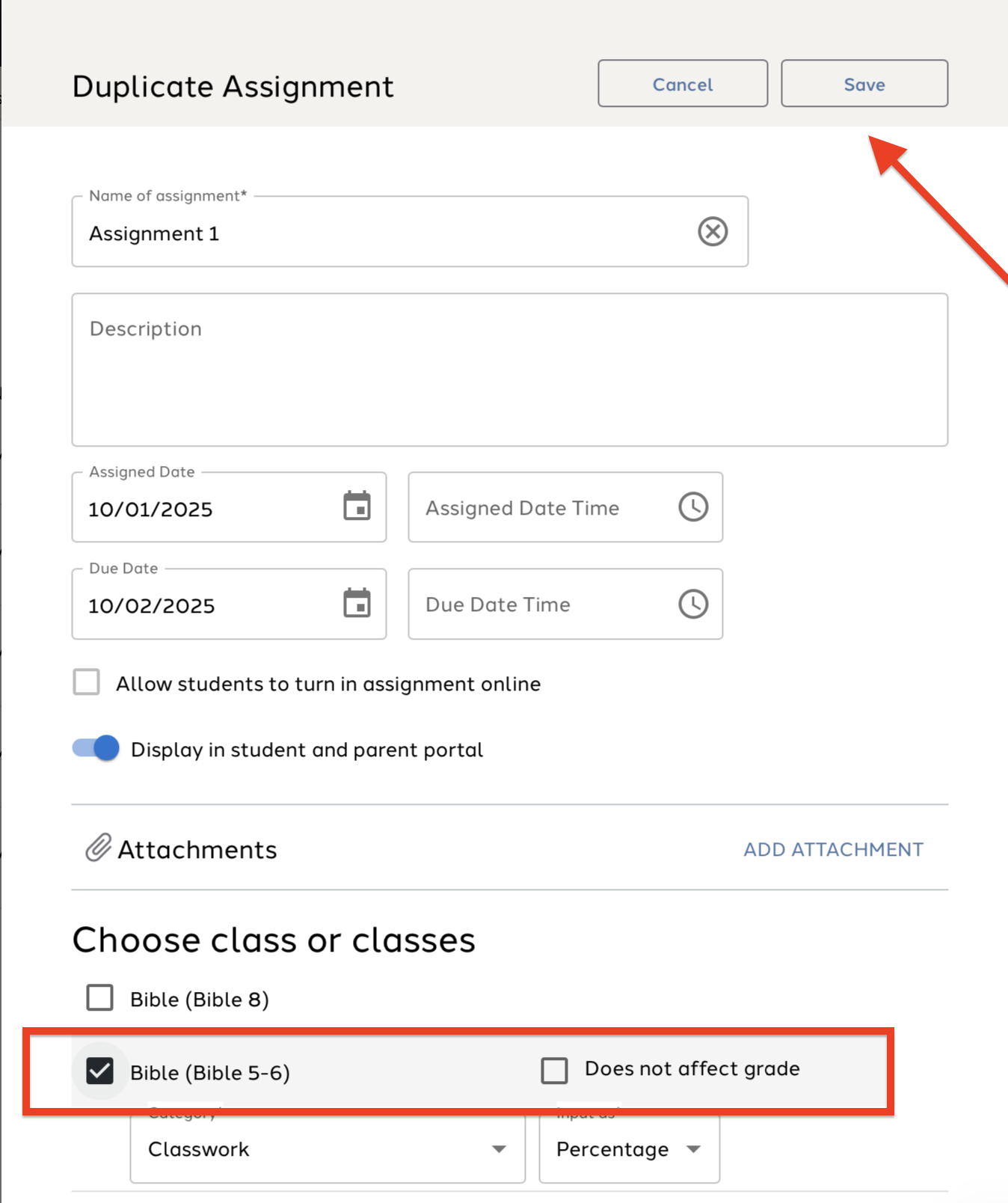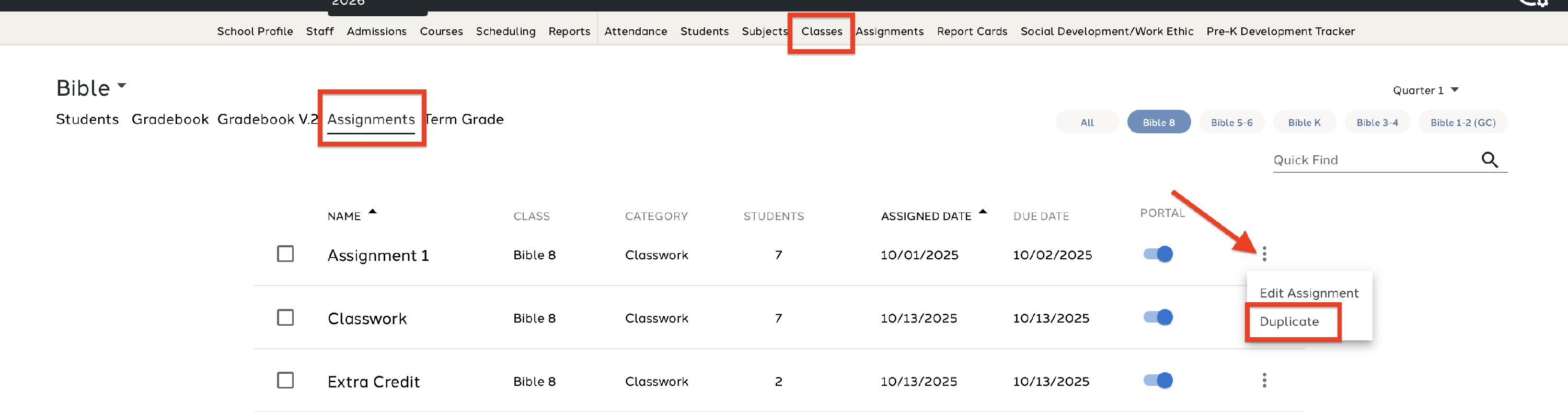 AE-Connect allow users to duplicate an assignment from one class to another. Duplicating a class happens in the assignment tab or in the assignments list under each class.