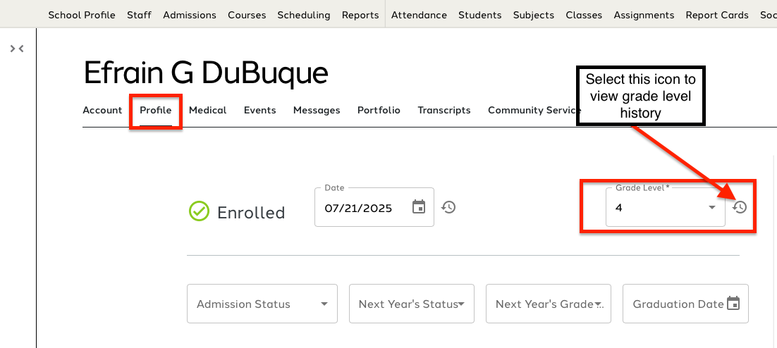 The grade level has been moved from the Student Account to the Student Profiles page. Grade Level history has also been added. The grade level history can be accessed by selecting the icon next to grade level.