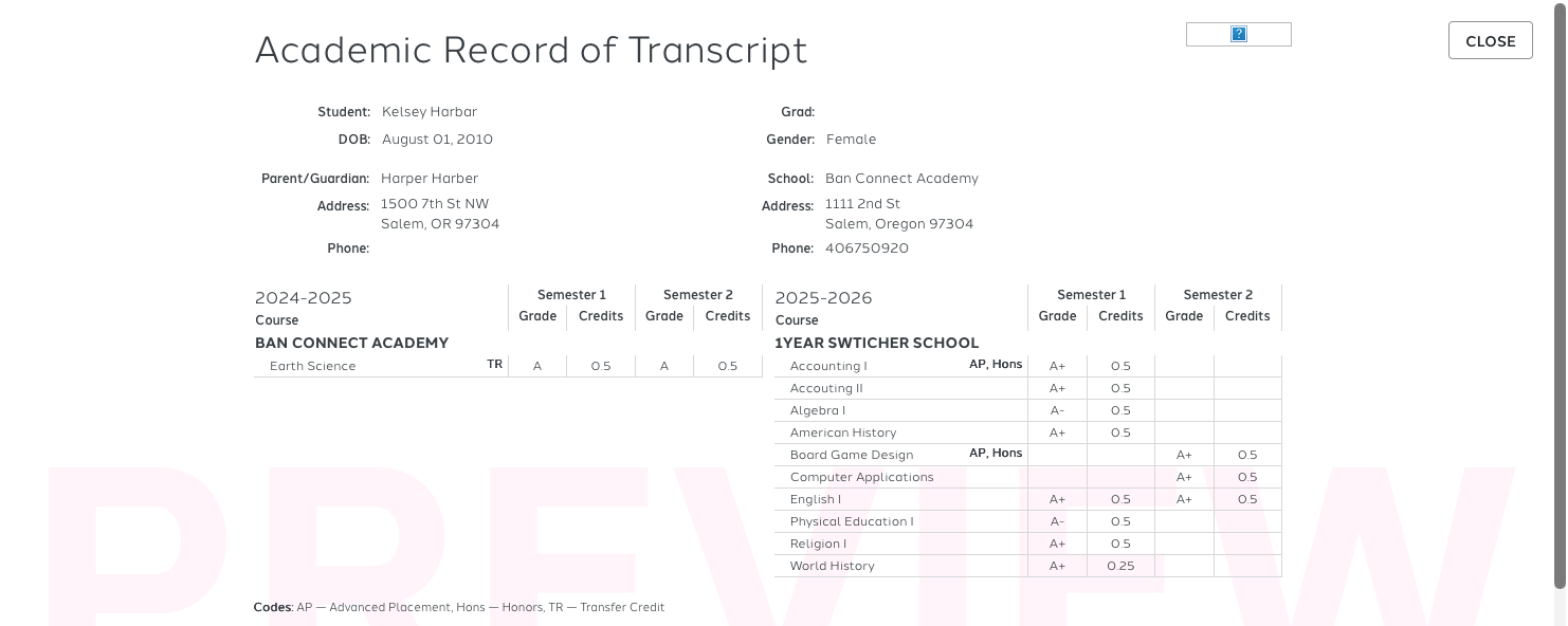 Transfer, AP, and Honors designations are now displayed on transcripts. Schools utilizing the checkboxes for AP or Honors courses will have these designations reflected on student transcript records. Additionally, transcript records will indicate Transfer status when the record is identified as a transfer.