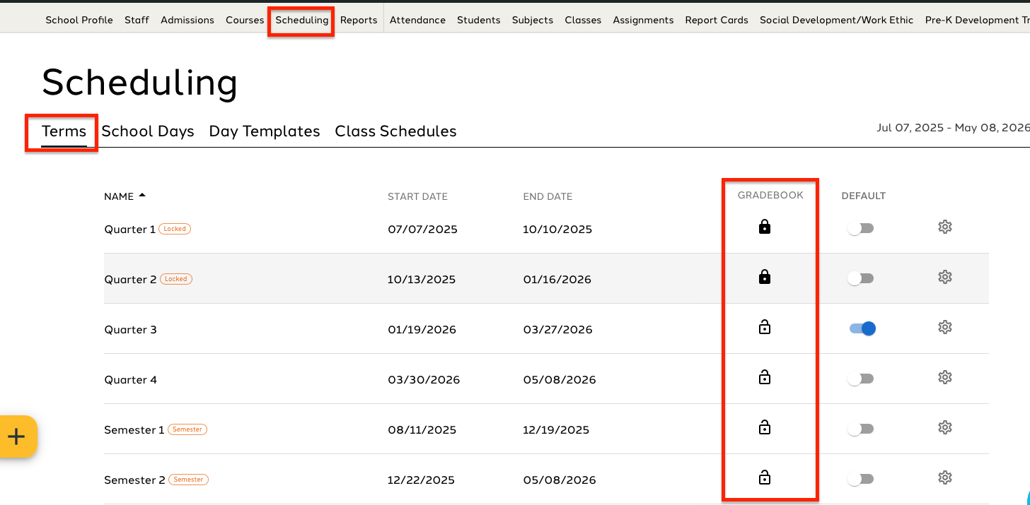 AE-Connect enables users to lock terms. Locking a term restricts any modifications to the classes, assignments, grades, term grades, skills and report cards within that term.
