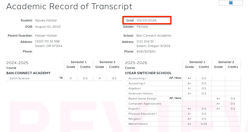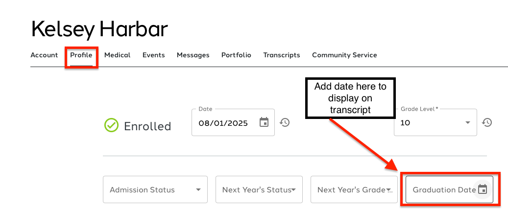 The school can add graduation date to each student in Student Profile. The graduation date will now appear on the high school transcripts.