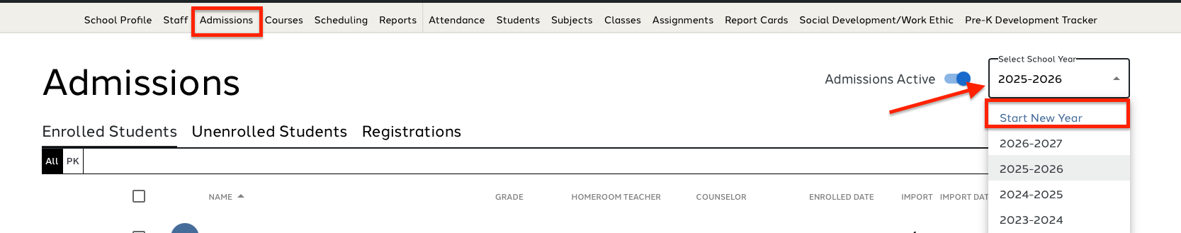 The user should locate Admissions on the main navigate bar. Locate the Select School Year dropdown in the upper right corner of the screen, click and select Start New Year.