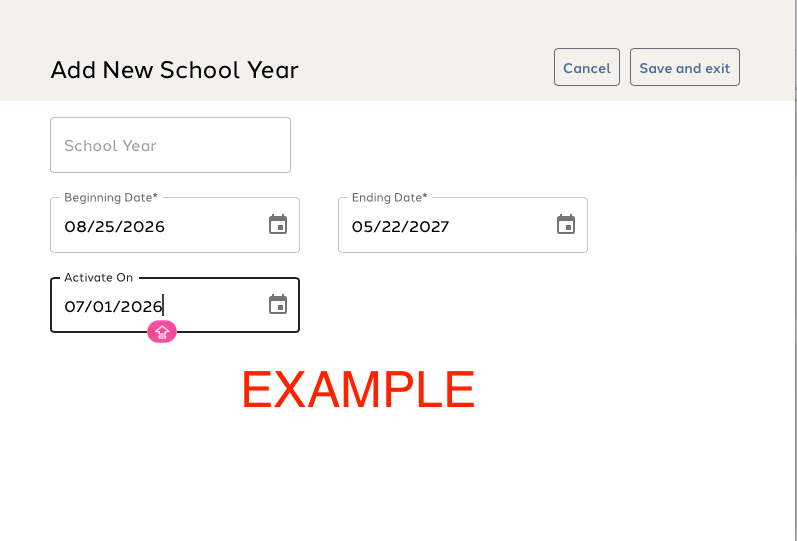 DO NOT enter an “Activate On” date before the current school year ends, or the entire system will switch prematurely to the new school year.